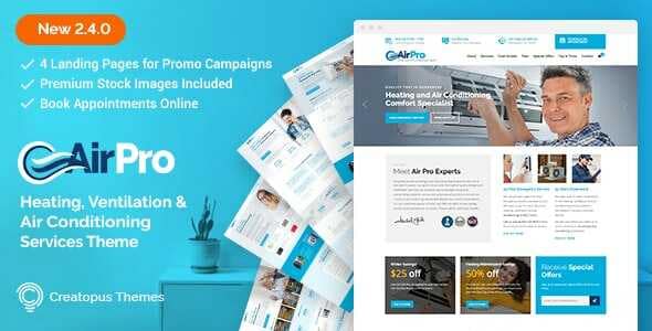 While focused on air conditioning, cooling/heating, and ventilation services, AirPro is an excellent platform for creating a modern business presentation for any small business, be it home repairs and maintenance service, an auto mechanic shop or a plumbing company.
